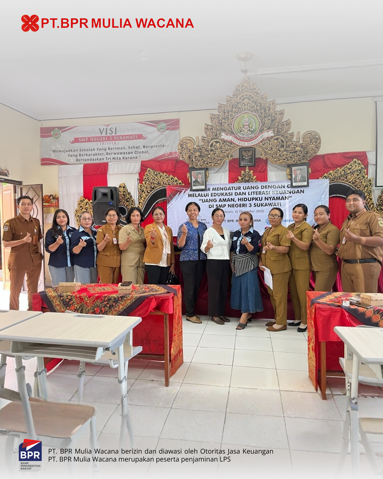 Belajar Mengatur Uang Dengan Ceria Melalui EDUKASI DAN LITERASI KEUANGAN “Uang Aman, Hidupku Nyaman” Bersama Siswa Siswi SMP Negeri 3 Sukawati. Edukasi dan literasi keuangan adalah kemampuan untuk memahami, mengelola, dan mengambil keputusan yang tepat terkait uang dan keuangan dalam