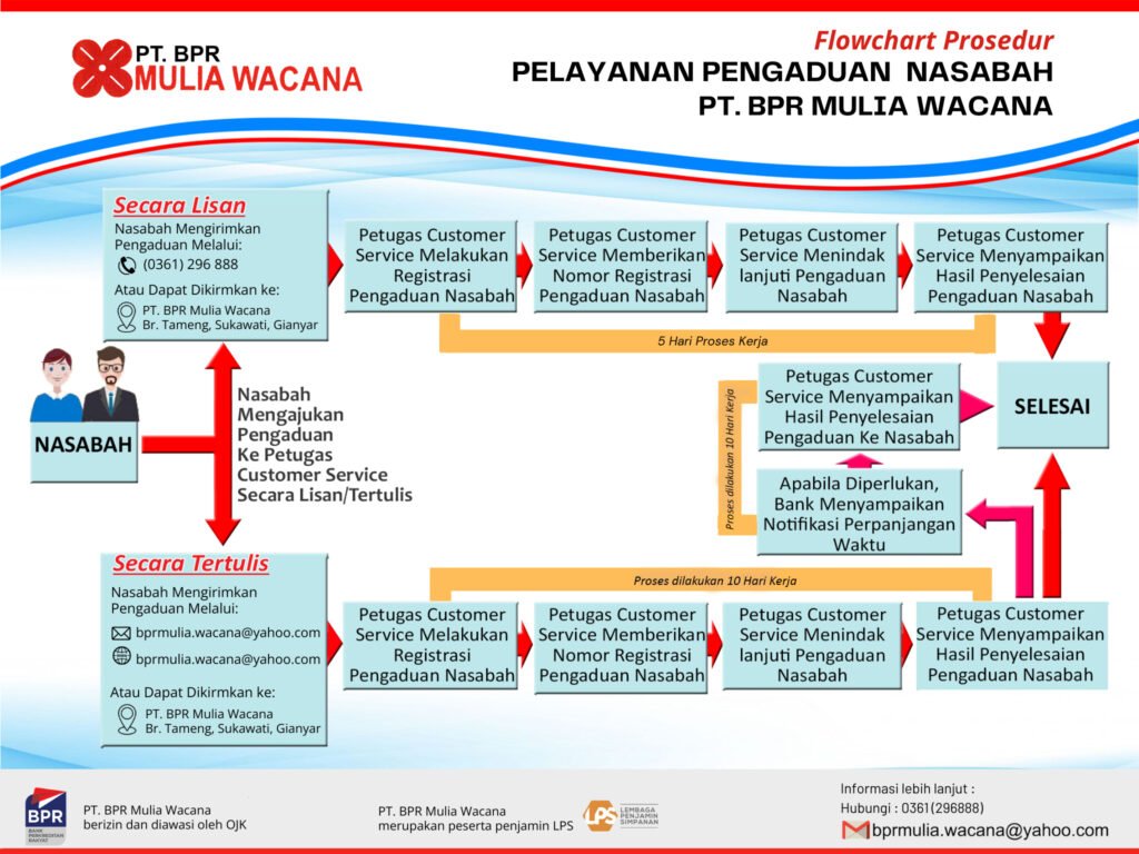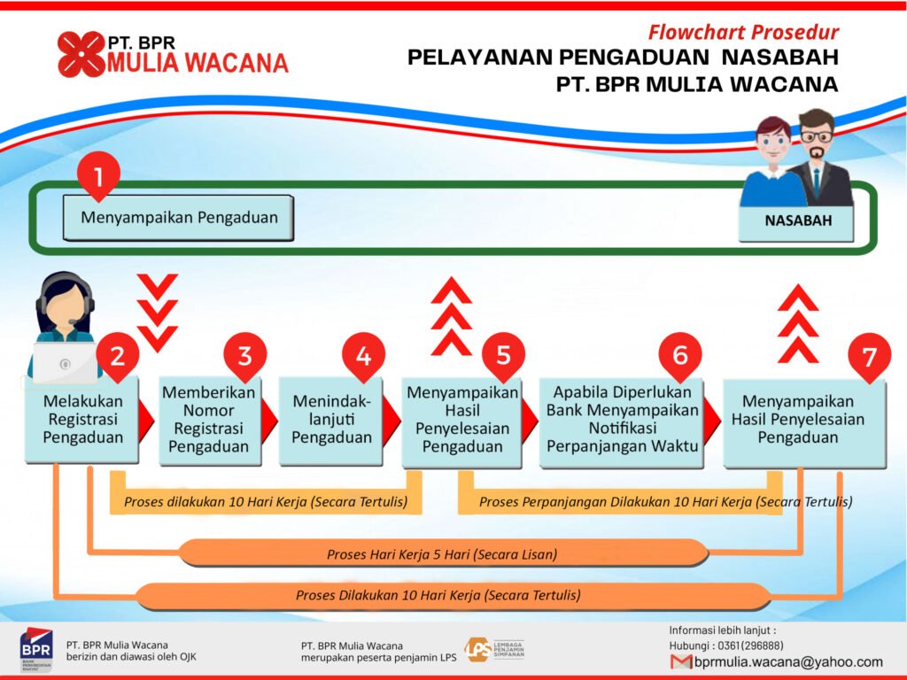 Mengacu kepada Peraturan Otoritas Jasa Keuangan Nomor 22 Tahun 2023 tentang Pelindungan Konsumen dan Masyarakat di Sektor Jasa Keuangan dan mengingat Peraturan Otoritas jasa Keuangan Nomor 18/POJK.07/2018 tentang Layanan Pengaduan Konsumen di Sektor jasa Keuangan serta mengingat Surat Edaran Otoritas Jasa Keuangan No. 17/SEOJK.07/2018 tentang Layanan Pengaduan Konsumen di Sektor Jasa Keuangan, dengan ini kami informasikan Prosedur Singkat Layanan Pengaduan Nasabah PT BPR Mulia Wacana sebagai berikut:
